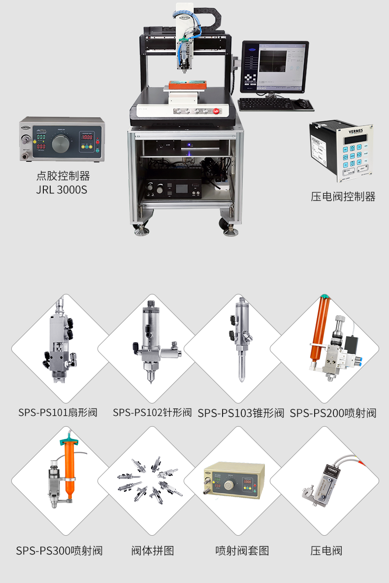 SPS-PS300是一款非接觸式噴射點(diǎn)膠閥,可廣泛應(yīng)用于表面貼裝膠、導(dǎo)電銀漿、IC封裝膠、底部填充膠、密封膠、表面涂敷膠等各類膠粘劑的可控流量、高速點(diǎn)膠作業(yè)。既能射入小到百微米的狹窄空間,也能在指定位置完成重量到0.01毫克級(jí)別的精準(zhǔn)點(diǎn)膠。