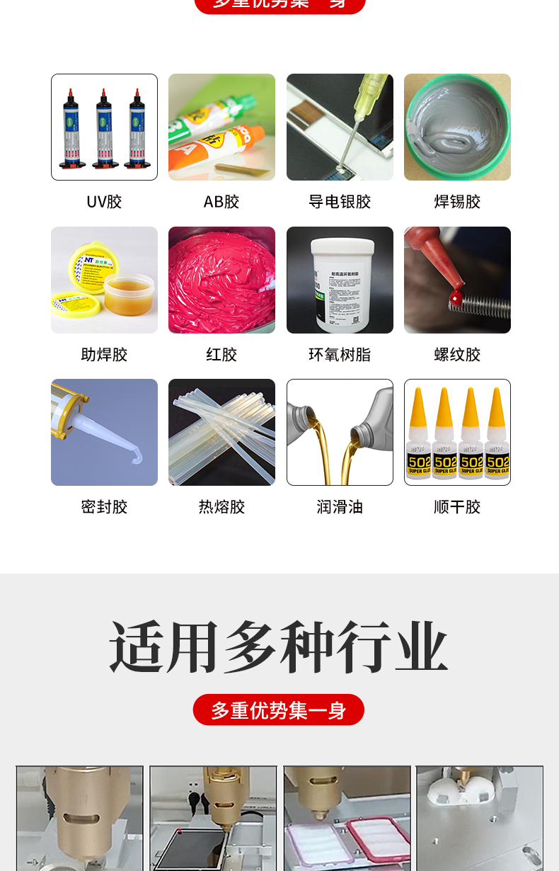 9. 適用于各式需求點(diǎn)膠產(chǎn)業(yè),如:一般常見的 UV 膠、硅膠、silicon、紅膠、COB 黑膠、導(dǎo)電膠、錫膏等點(diǎn)膠,皆可使用再 D 系列設(shè)備上。
