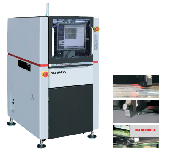 非接觸式噴射閥,Z軸不用升降,從而拓寬更廣的適用領域。成熟穩(wěn)定的高速、高精度運動平臺。自動恒溫,確 保涂料的流動性一致。搭載高精度稱重系統(tǒng),確保膠量一致,減少材料浪費,提升產(chǎn)能和良率。在線式輸送系 統(tǒng),可與其他設備通訊。精密視覺定位與自動視覺抽檢系統(tǒng)。自動測高系統(tǒng),基板翹曲無影響。Windows 界面 控制軟件操作簡便,編程容易??扇我獯钶d噴射閥、螺桿閥及氣壓閥。模塊式設計、可任意搭載選配項功能。 高速噴射,每秒最高200點??扇我庠O定點的大小,能實現(xiàn)更小的點膠直徑。真空清潔嘴裝置。